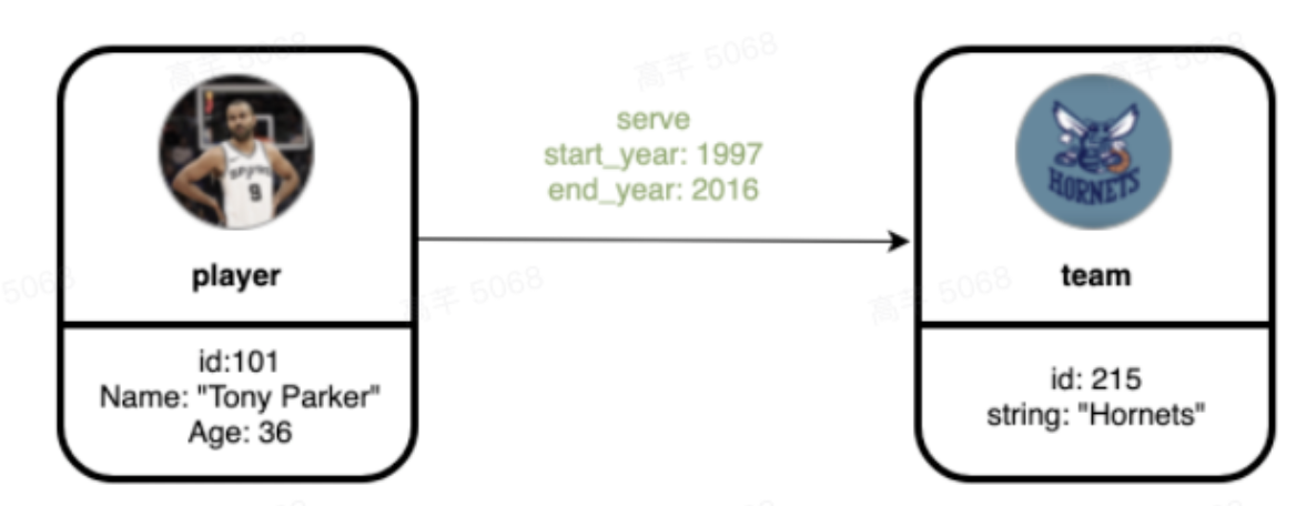 - id,name,age为点的属性,serve,start_year,end_year为边的属性